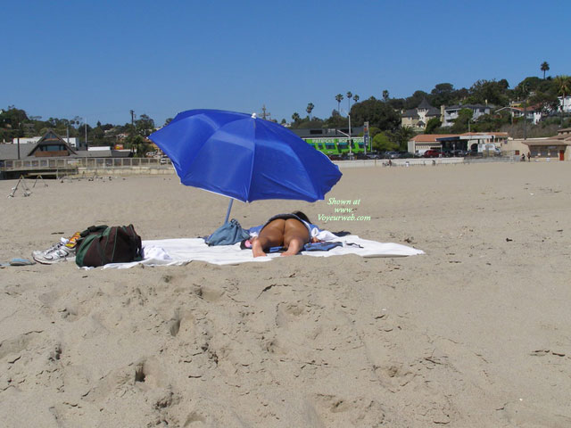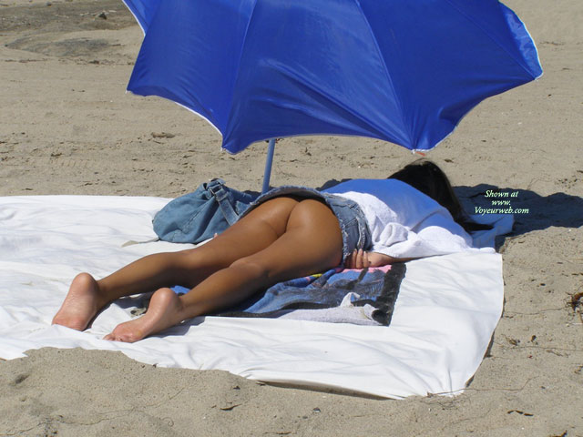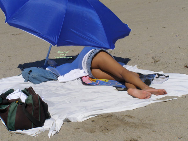 I was walking the beach in Malibu last Thursday and it was very windy and a liitle cool. I was about to turn around when I saw a girl off in the distance who was obviously taking shelter from the blowing sand under an umbrella that was stressing in the wind. As I got closer my hands were trembling when I realized what lay before me on this near secluded part of the beach. I walked by about 5 times sneaking more and more pictures as discreetly as possible. This is when it pays to have a 12X zoom. She was either asleep or near asleep but I suspect she knew damn well what she was showing. When I saw her husband/boyfriend making his way back from the parking area I had to split but not before getting off over 80 pictures.